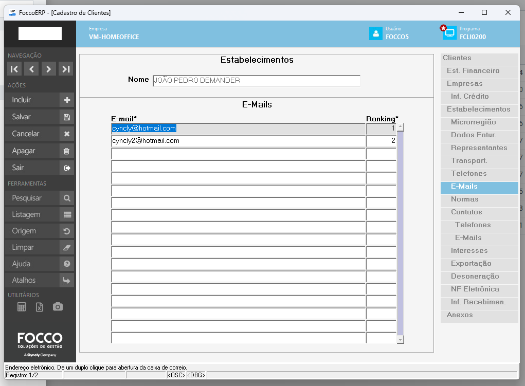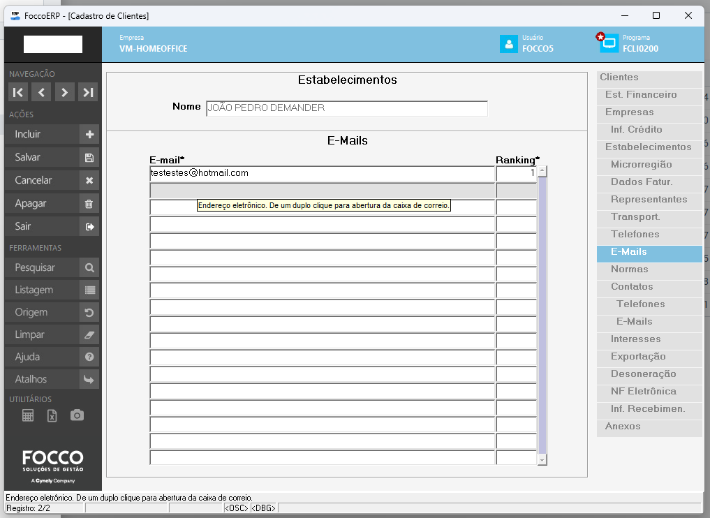 (I) Somente quando a origem do cadastro for do FoccoINTEGRADOR e